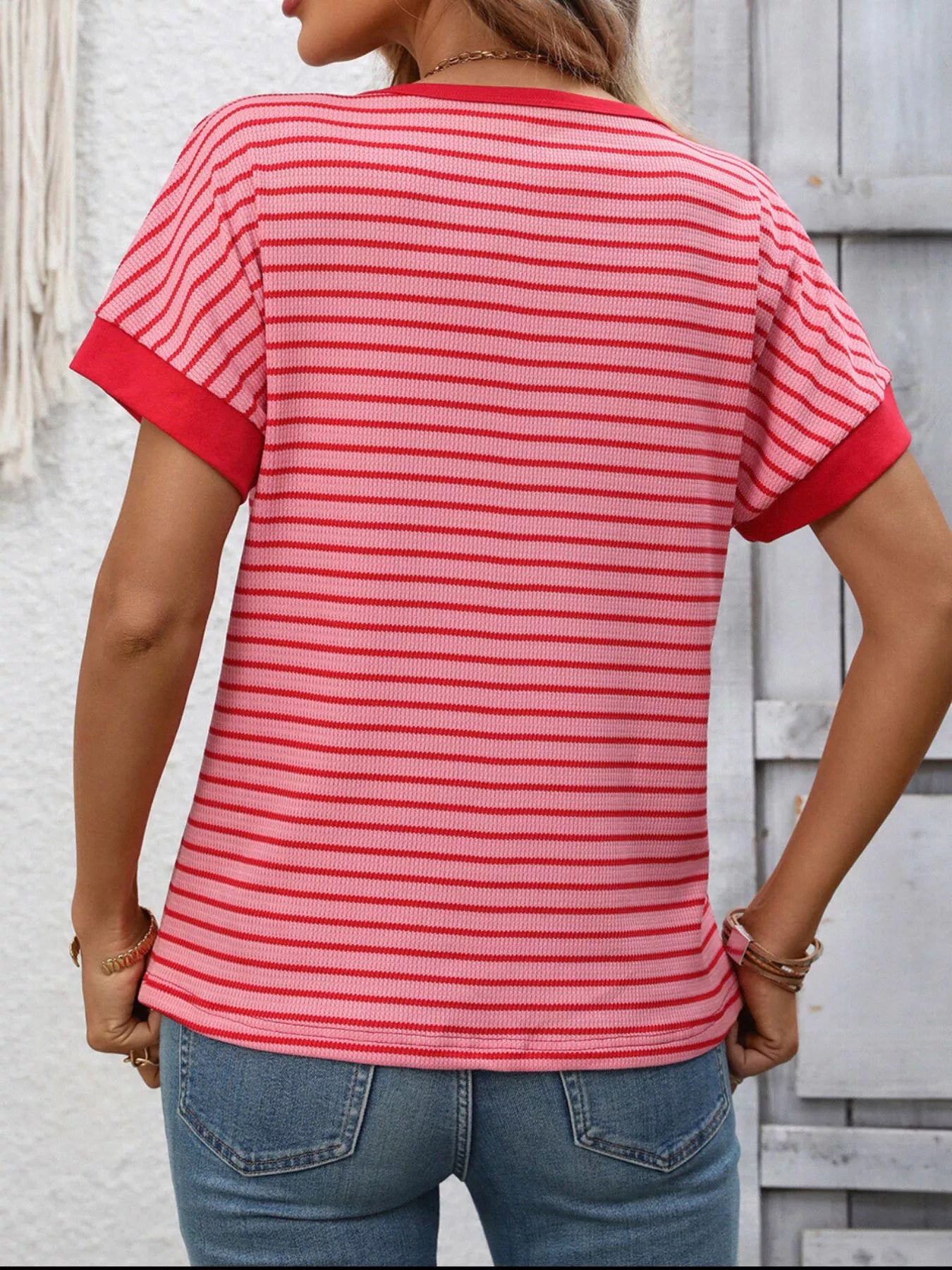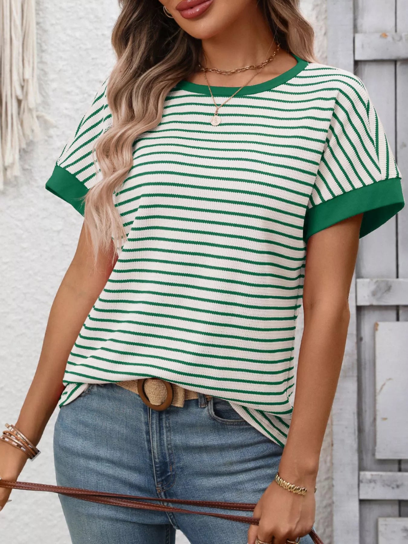 Stripes never go out of style—especially when they're paired with a cozy ribbed knit that hugs in all the right ways. This short sleeve tee is your new go-to for effortless layering and casual comfort. Throw it on with your favorite jeans, dress it up with a blazer, or rock it solo. Classic stripes meet modern comfort in one seriously wearable piece that works as hard as you do.